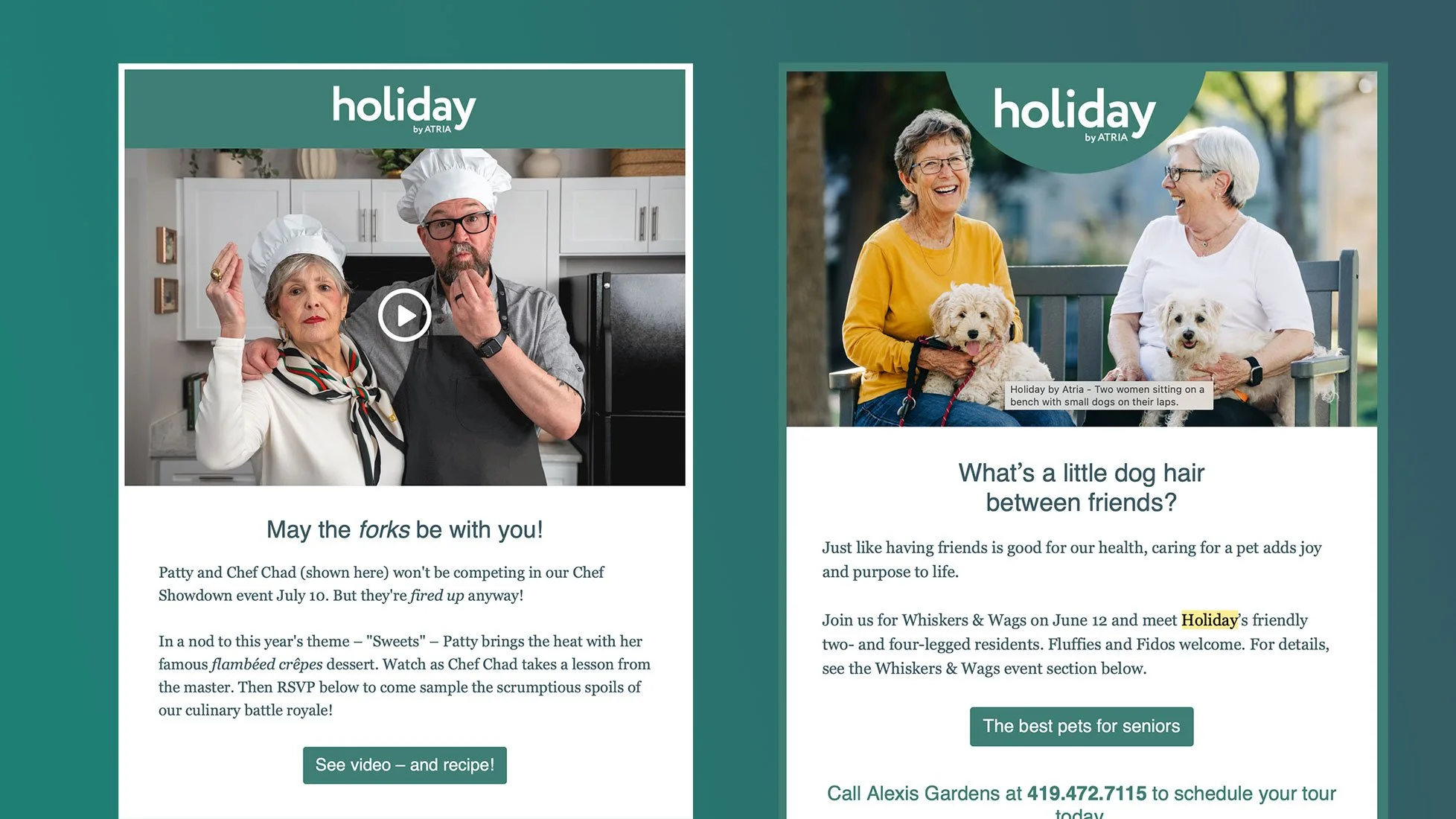 Over the past three years, I’ve led the development of a refreshed visual identity, a comprehensive content strategy, and a new blog platform to better connect with prospective residents and families. I also launched a targeted email program, directed multi-channel campaigns, and overhauled Holiday’s photography, video, and sales collateral. Additionally, I revitalized the brand’s YouTube channel with episodic storytelling and led creative for community signage and vehicle branding.